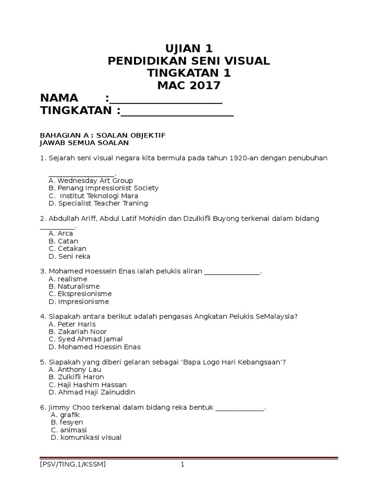 Pendidikan Moral Pendidikan Seni Visual PSV Pendidikan Jasmani dan Pendidikan Kesihatan PJPK Pendidikan Muzik Bahasa Iban Bahasa Kadazandusun Bahasa Semai. Contoh Soalan Peperiksaan PSV Tingkatan 1 - Kertas 1. 1st - 9th grade.